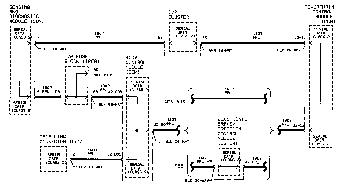 If communications cannot be established with any modules, (BCM, PCM, SDM, or EBTCM) the fault is related to the Class II link. Types of faults that will affect communications could be a short-to-ground, short-to-voltage and an open circuit between Data Link Connector (DLC) and BCM. Internal controller faults could also cause communications errors on the data link. Since the Class II link is wired in a ring configuration, an open circuit, except between DLC and BCM, will not affect communications with BCM.