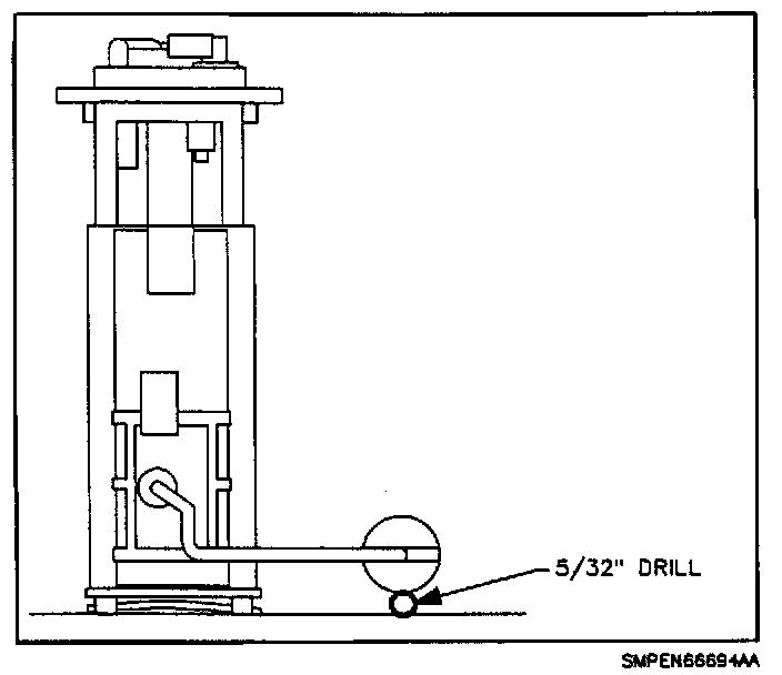 7. Verify that the float arm on the fuel level sender has not been bent by standing the fuel pump module on a flat, horizontal surface and measuring the distance from this surface and the bottom of the float. A 5/32 in. diameter drill bit can be used as a gage. The gage must freely pass between the float and the horizontal surface with no more than 1/16 in. clearance.