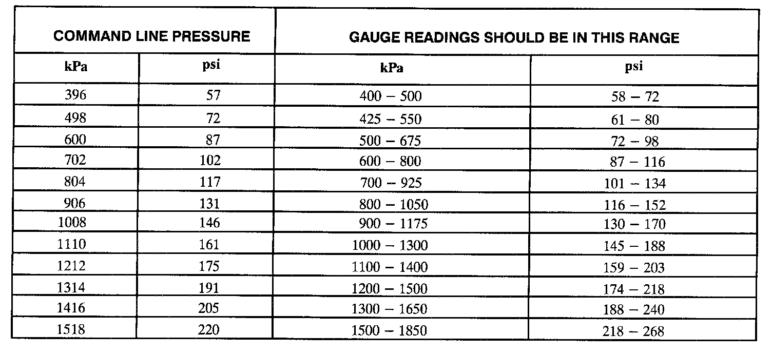 - With engine idling in Park, line pressure should be 400 - 600 kPa (58 - 72 psi).