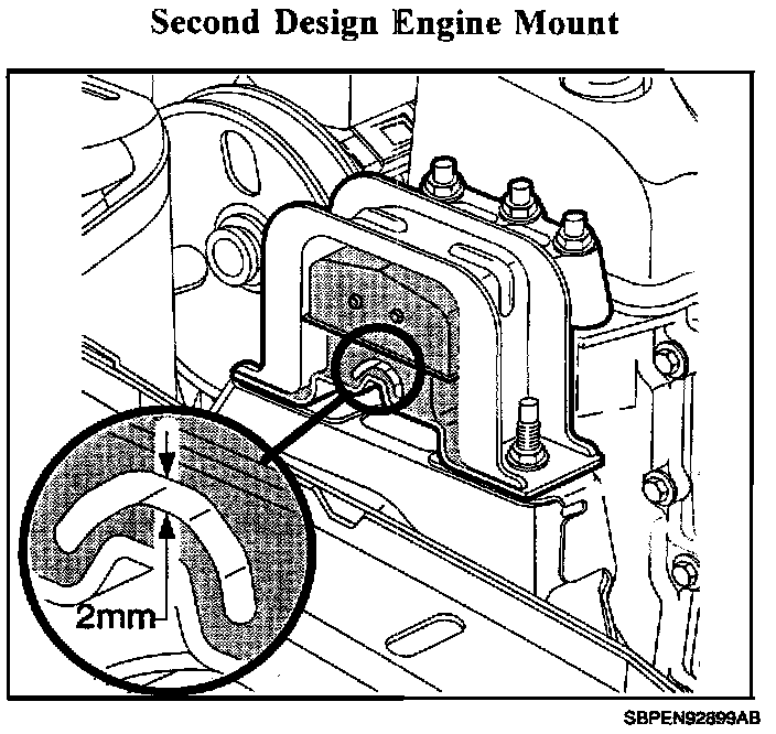 1. Inspect the vehicle to see if current top engine mount is a first or second design mount. Refer to the following illustrations.^ If the mount is first design, proceed to step 2 of this procedure. If the mount is second design, proceed to step 3 of this procedure.