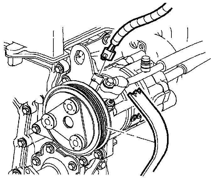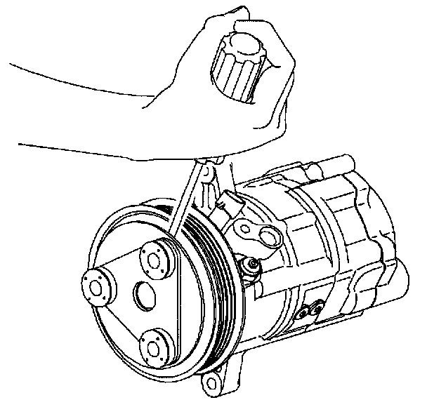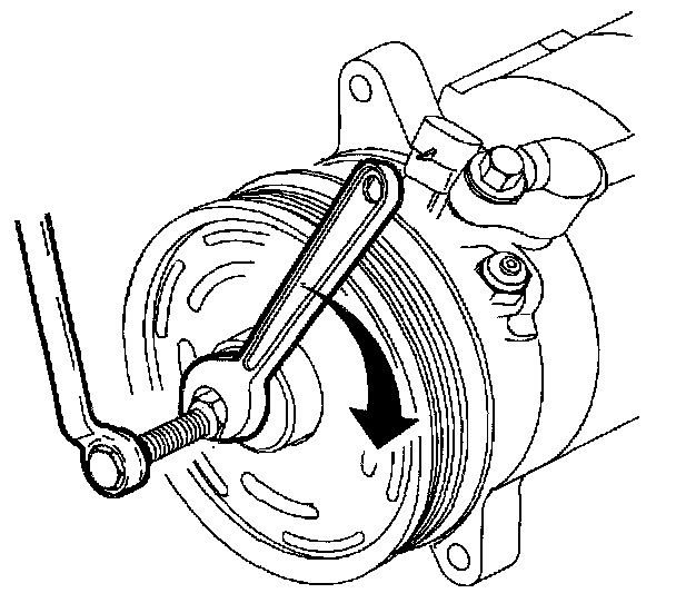 1. Remove accessory drive belt from compressor clutch pulley by rotating belt tensioner clockwise using a 14 mm or 9/16 in. wrench. Snap-On(TM) tool S8190A (or equivalent) can be used.