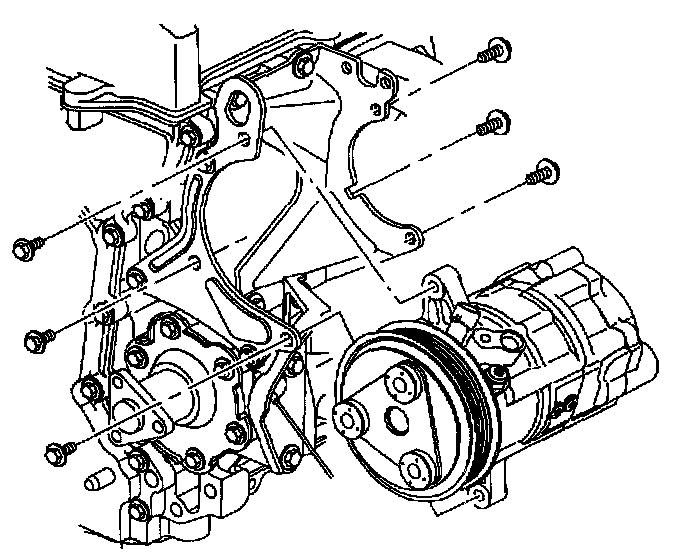 11. Remove front A/C compressor-to-engine bracket bolts.