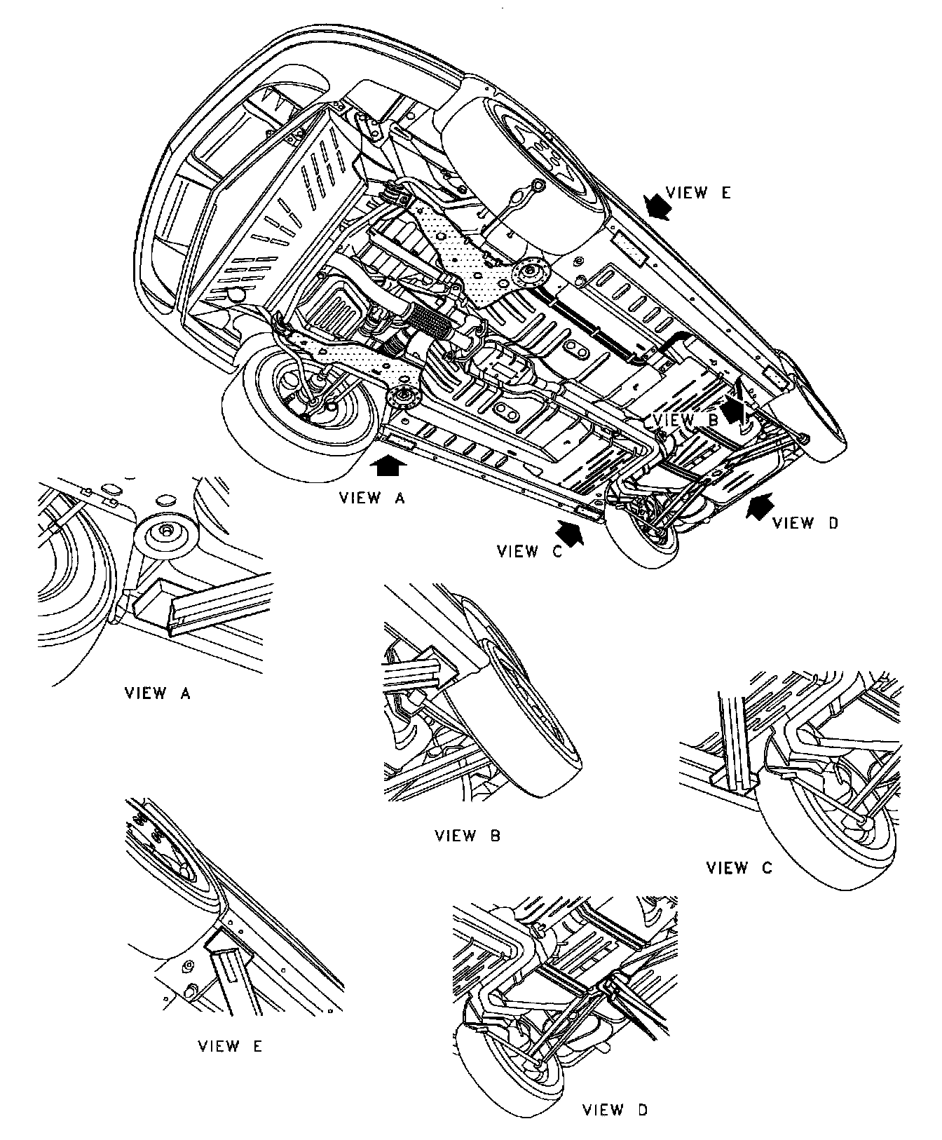 When using a floor jack, position the jack under the rear crossmember (View D of Figure on the facing page).
