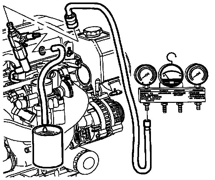 The fuel system leakdown test will determine if the fuel system is able to hold fuel pressure when the fuel pump is not operating. The system must hold pressure to assure that the fuel supply circuit (fuel lines, filter/regulator, and fuel rail) is full of fuel. When the fuel supply is completely charged, fuel will be available at the injectors as soon as the ignition is turned on.CAUTION: Do no not allow smoking or the use of open flames in the area where work on the fuel system is taking place. Anytime work is being done on the fuel system, disconnect the negative battery cable, except for those tests where battery voltage is required.