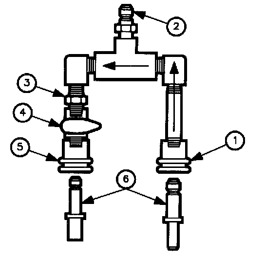 It is connected with the inlet side (1) to the fuel feed (either at the fuel rail or at the filter/pressure regulator inlet), the outlet (5) to fuel return (or drain), and the gauge port (2) to the pressure gauge. The ON/OFF control valve (4) provides a means to control fuel flow for pressure and leakdown testing.