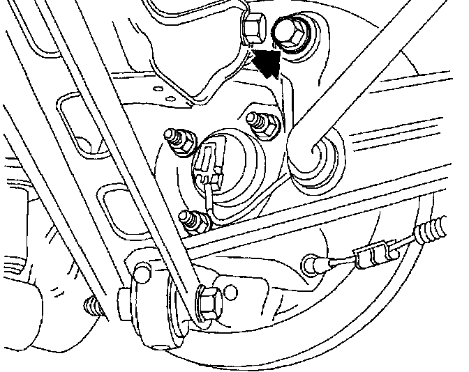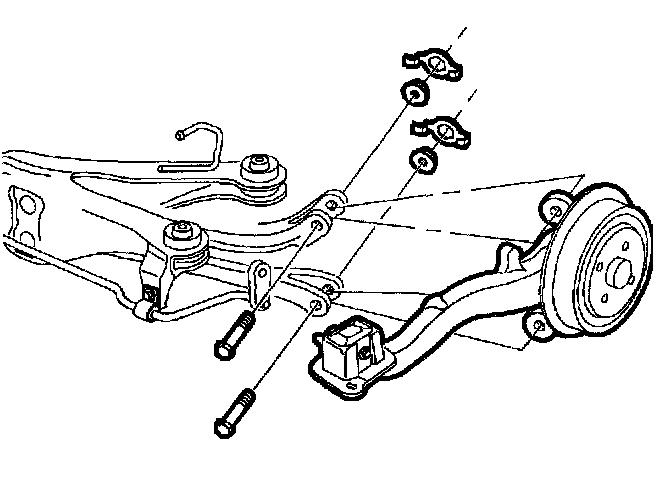 5. Remove upper and lower control arm to rear axle control arm attachment bolts, discard bolts and nuts.