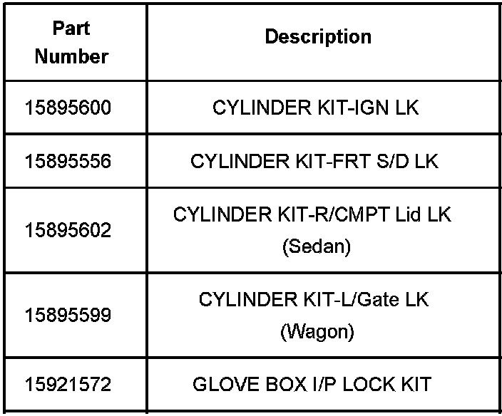 The purpose of this bulletin is to inform Saturn Retailers of a change to service parts availability for Saturn L-Series lock cylinder components. The current lock cylinder kits for the doors, ignition cylinder, and rear compartment lid or liftgate cylinder will be modified to now include additional component parts to build up a complete ignition, door and rear compartment lid or liftgate lock cylinder assemblies. Additionally, once inventory of the lock cylinder individual component parts (tumblers, springs, levers, shutter, cap, etc.) are depleted, these component parts will only be available as part of the new lock cylinder kits.
