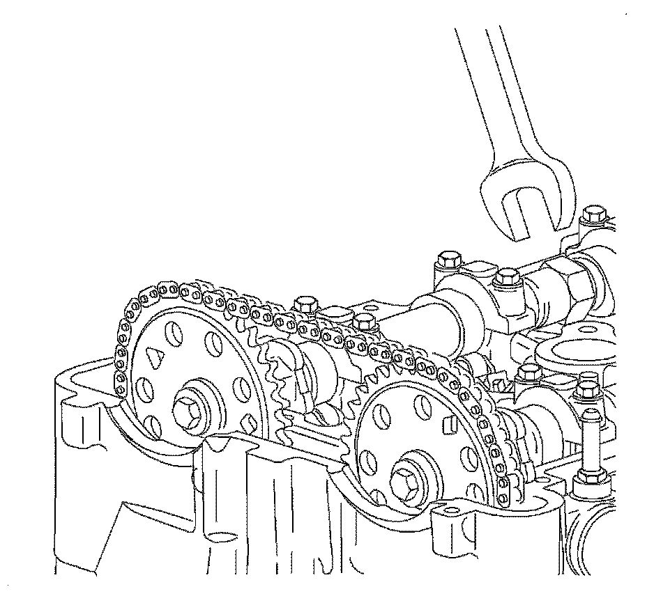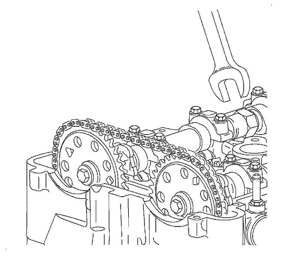 Notice: Use a 24 mm wrench to support the camshaft while applying torque to camshaft sprocket bolt. Do not torque camshaft bolts against timing chain, as it may damage the timing chain.
