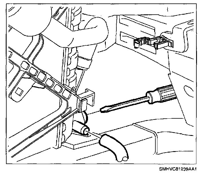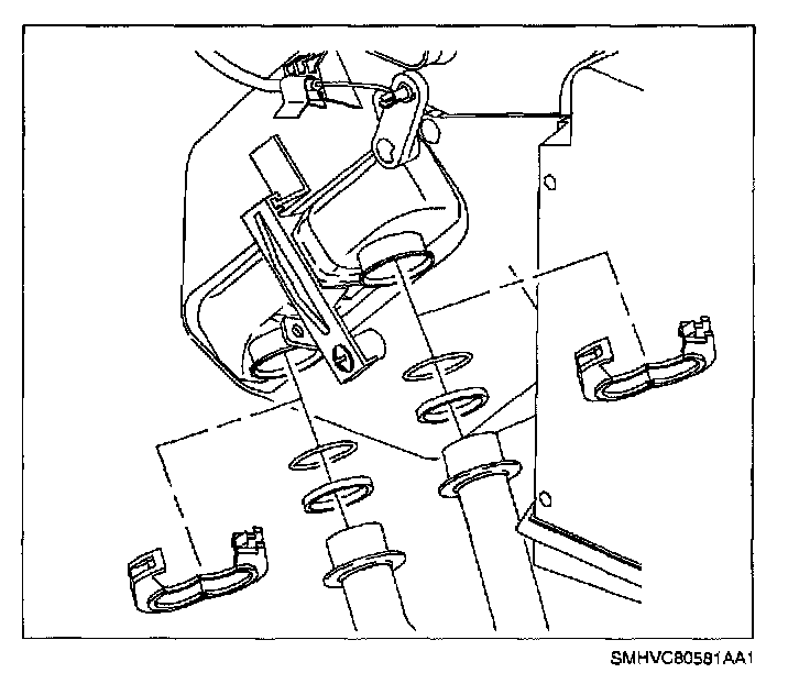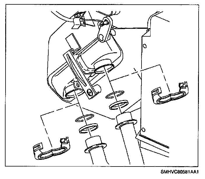 14. Remove heater core pipe to heater core clamps. Clamps may need to be rotated to gain access to clamp retaining tab.