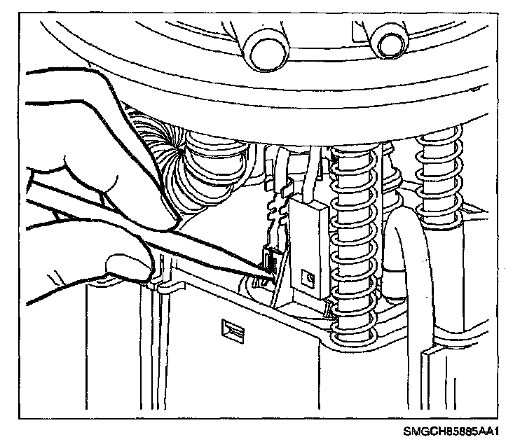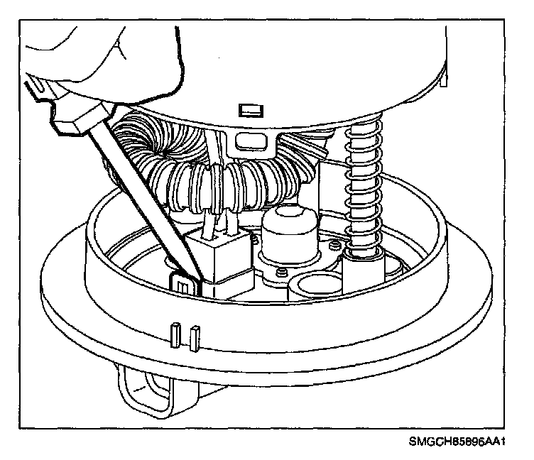 7. Remove connector housing from bottom side of fuel pump cover. (Disengage locking tab with fingernail or small flat black screwdriver.)