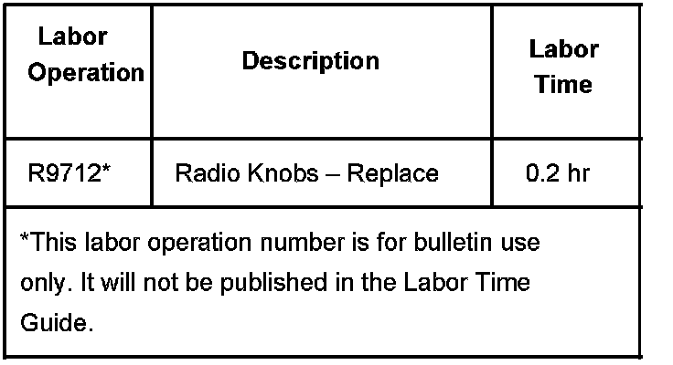 This bulletin is being issued to advise technicians and service personnel that some radio knobs can be serviced without removal of the radio. Many radios have been returned with damaged/discolored knobs that could have been replaced at the dealership. Refer to the table below for usages.