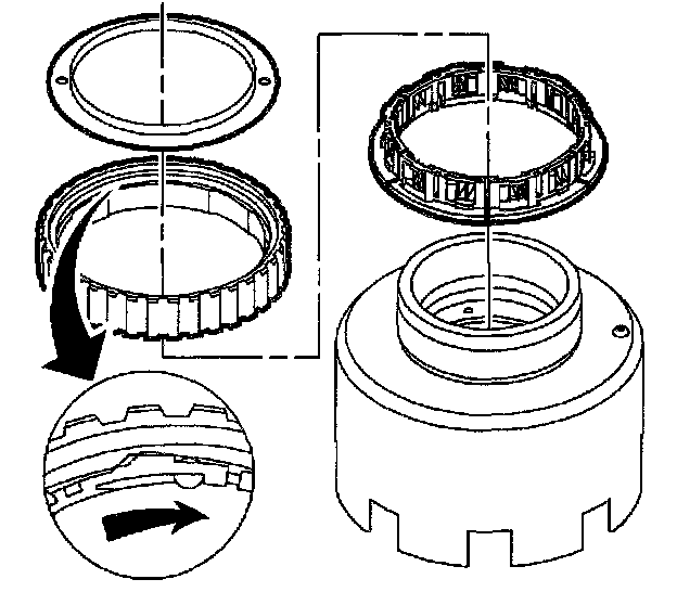 4. Assemble a new 2nd roller clutch retainer onto 2nd roller clutch assembly. Use J41235 in order to press retainer and roller clutch assembly into place on reverse clutch housing and roller clutch inner race.