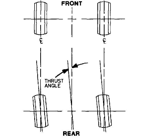 Thrust angle is the angle between the geometric centerline of the vehicle and the direction that the rear wheels track. Ideally, the thrust angle is equal to zero.