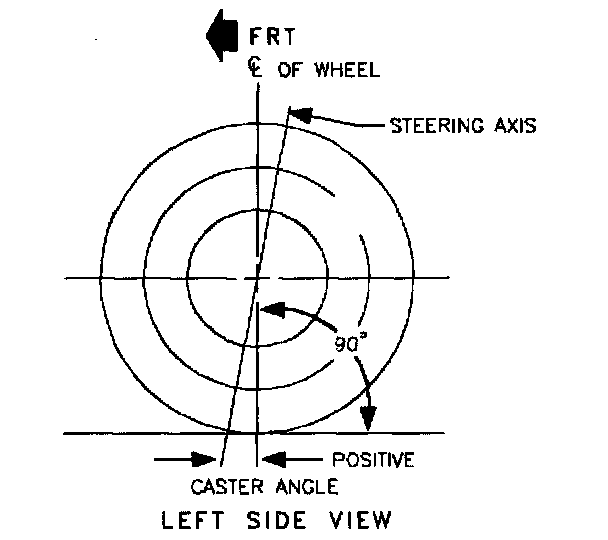 Caster is a measure of the angle between the steering axis and vertical when viewed from the side of the vehicle with the wheel in the straight ahead position. The steering axis is determined by the location of the lower control arm ball joint and the center of the strut-to-body attachment. A line drawn through the center of the ball joint and the strut-to-body joint represents the steering axis. When the center point of the strut-to-body attachment is rearward of the ball joint, the caster is positive. When the center of the strut-to-body attachment is forward of the ball joint, the caster is negative.