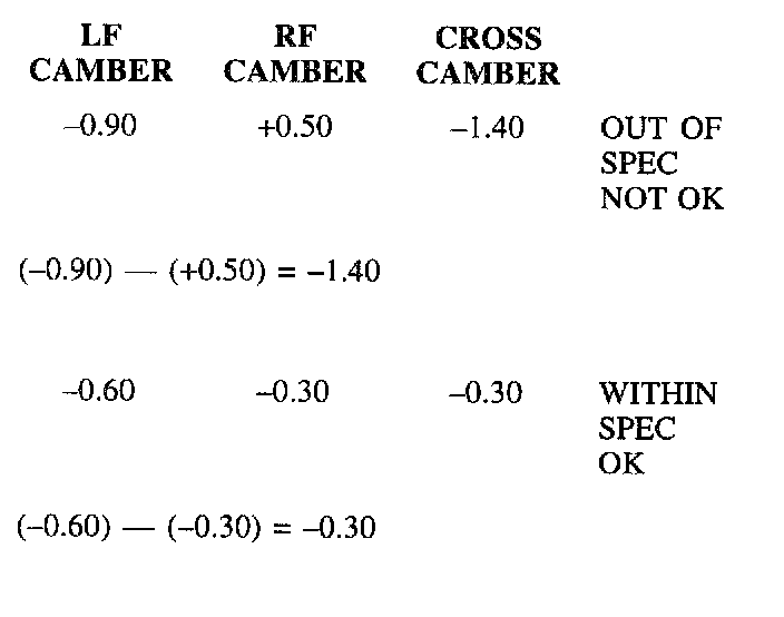Cross camber and cross caster specifications refer to the difference between the left and right side angles. Cross camber and cross caster can influence vehicle steering pull tendencies. Usually, alignment results will be best when these measurements are as close to zero as possible.