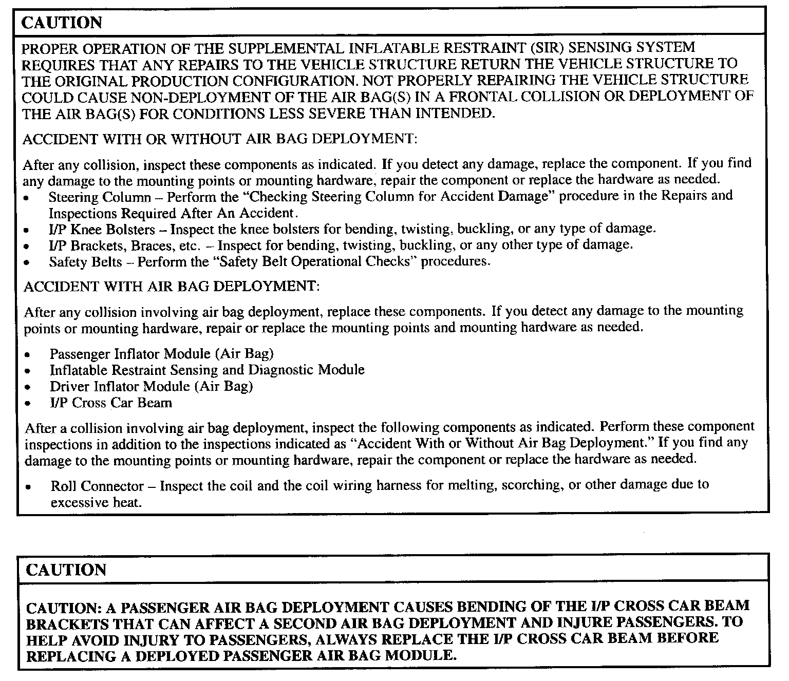 ^ INSPECT SIR SYSTEM COMPONENTS AFTER AN ACCIDENT, EVEN IF AIR BAGS DID NOT DEPLOY.