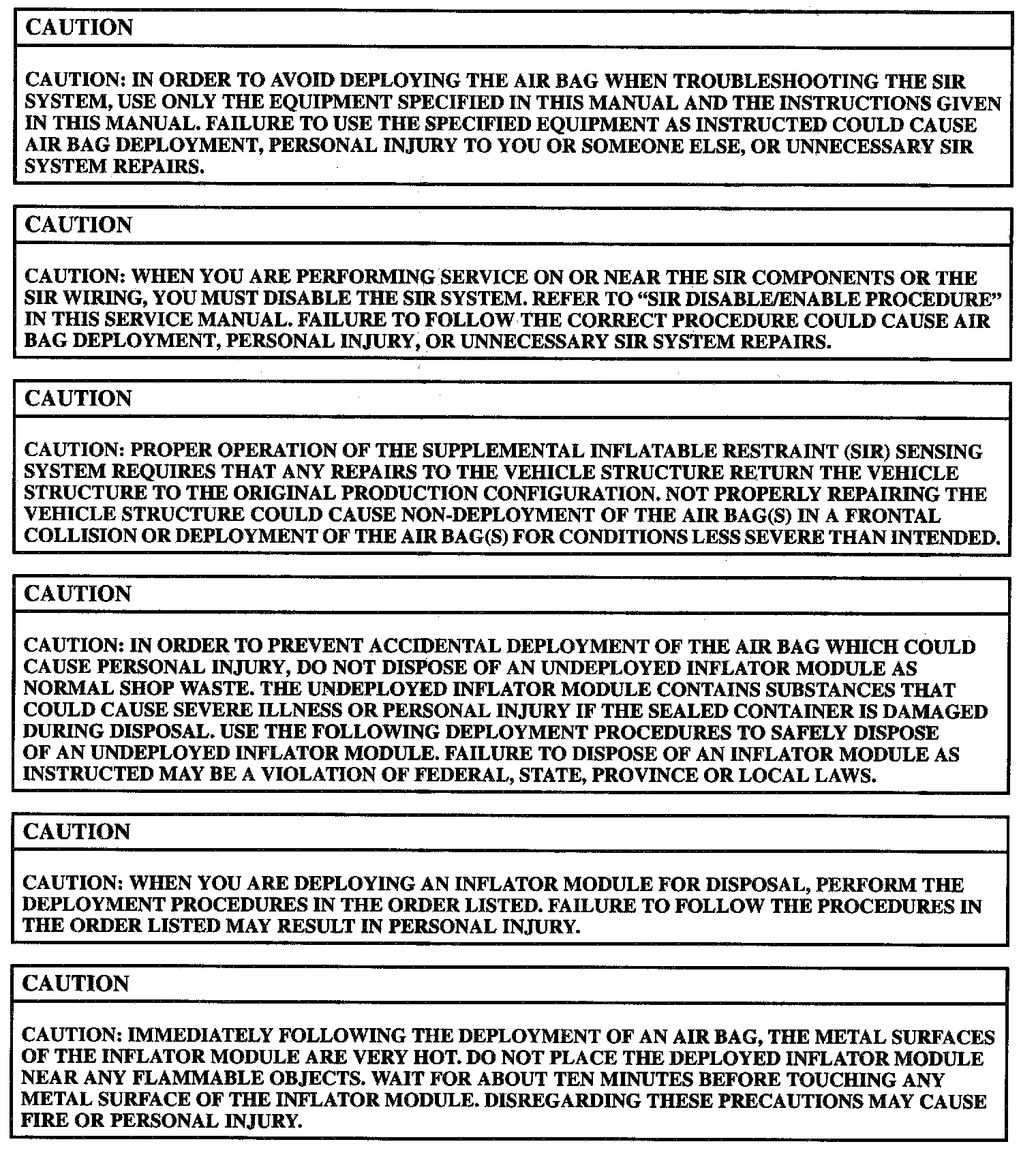 ^ DISABLE THE SIR SYSTEM WHEN WORKING ON OR NEAR THE SIR SYSTEM COMPONENTS.
