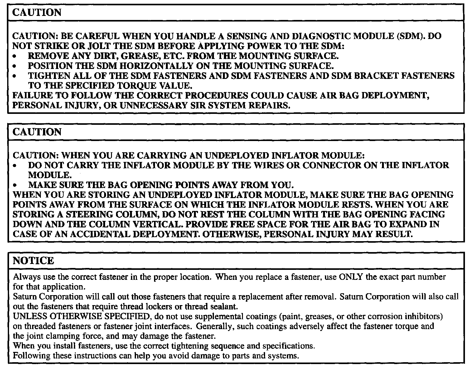 ^ USE SPECIAL CARE WHEN HANDLING OR STORING SIR SYSTEM COMPONENTS.