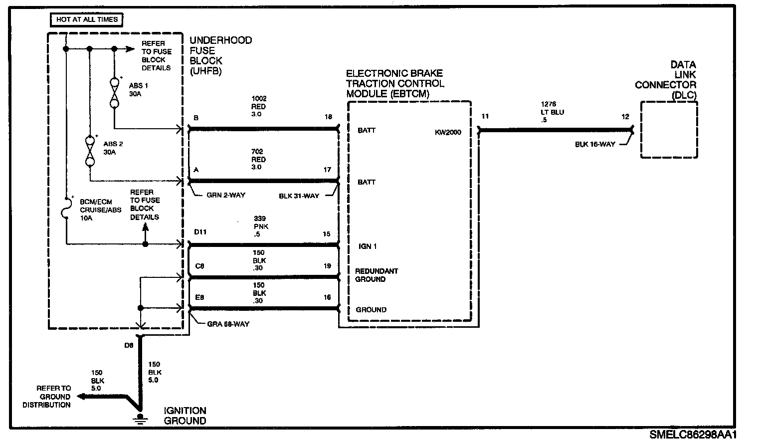 The electronic brake traction control module (EBTCM) has a dedicated keyword 2000 (KW 2000) data link. This data link is only used for diagnostics/reprogramming. If the Scan tool cannot establish communications with the EBTCM, the fault could be caused by: