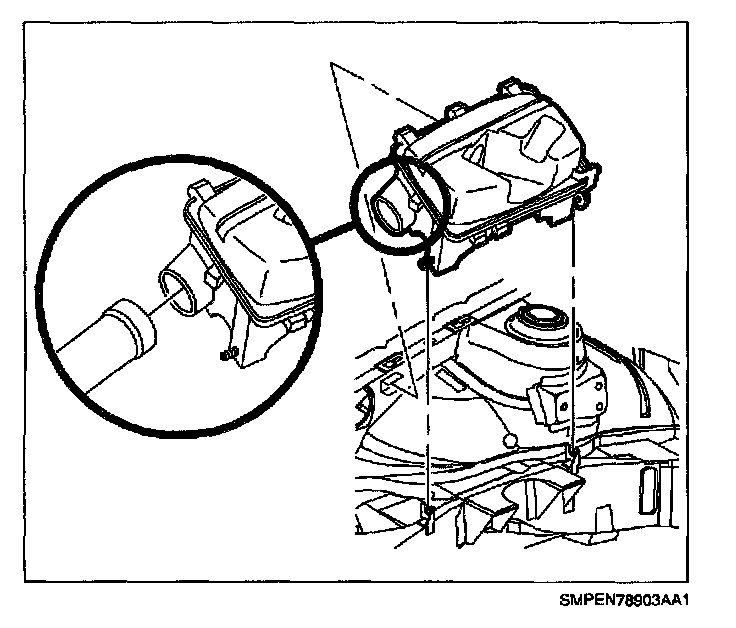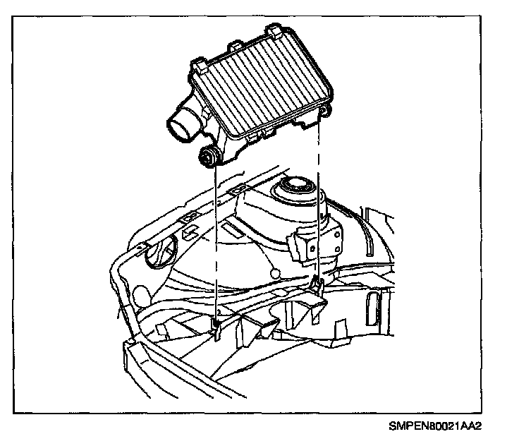 1. Install air box. Ensure that lower pin engages into rubber mount grommet and that lower duct fits into resonator outlet.