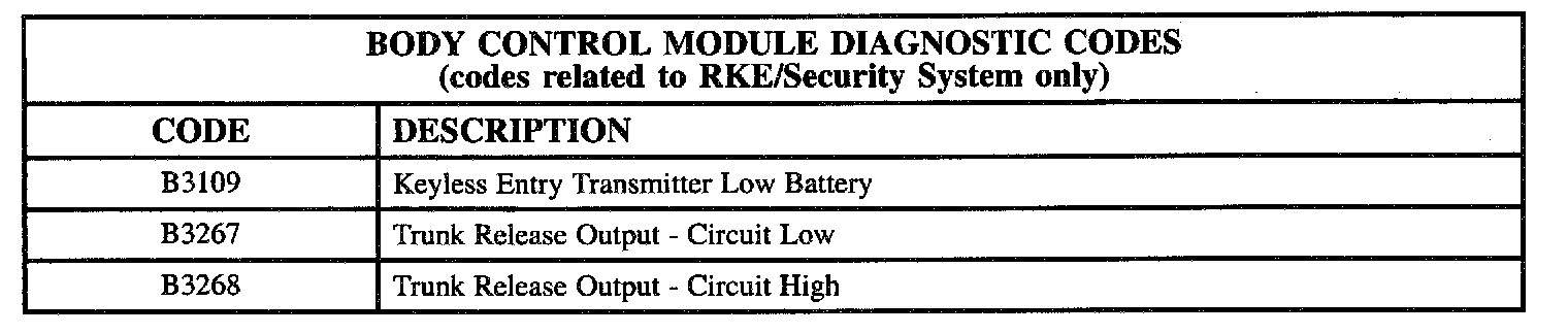 The table lists the Body Control Module (BCM) diagnostic codes related to the RKE/security system: