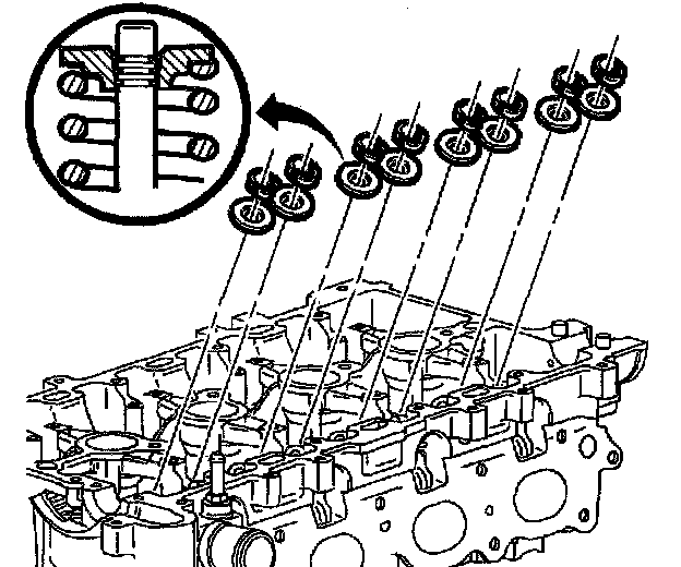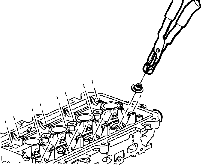 NOTICE: If a valve stem seal is removed after it has been installed, it must be discarded. The valve stem lock groove will cut the seal's lip during removal. Use extreme care not to damage valve stems when installing retainers.