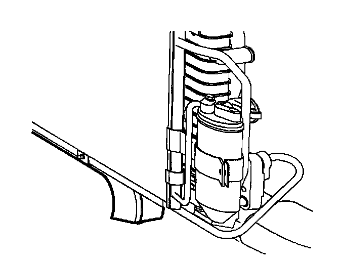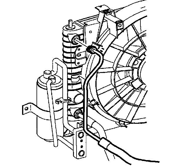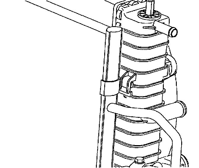 15. Install upper transaxle oil cooler line into radiator end tank retainer.
