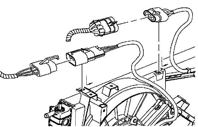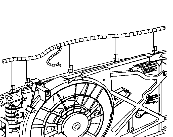 17. Route pusher fan electrical harness around outside of radiator end tank to upper fan shroud.