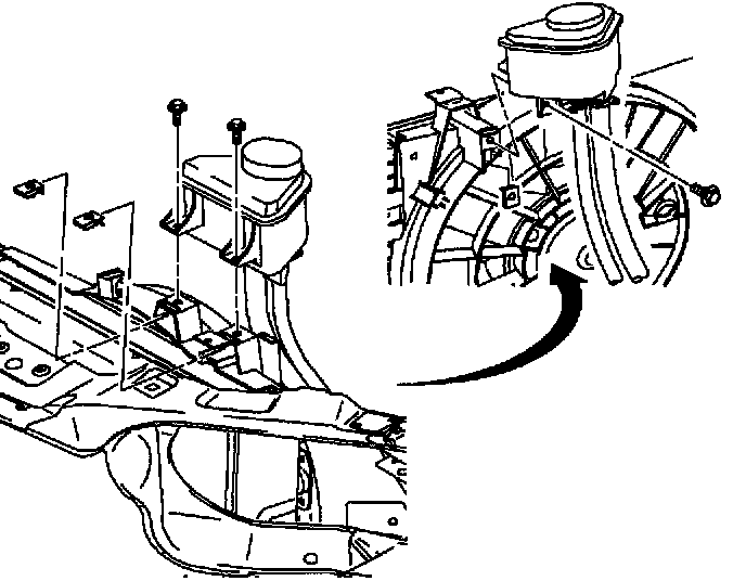 22. Install power steering fluid reservoir to fan shroud bolts.