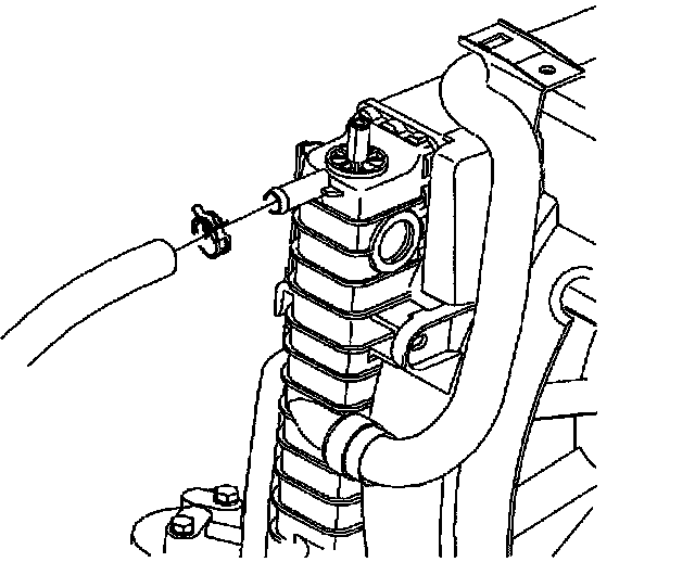 16. Remove cap and install upper transaxle oil cooler line to radiator end tank.