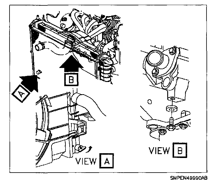 28. Rotate top of engine forward and secure engine with tie straps or mechanic's wire. The tie straps can be routed from the front engine lift hook to the radiator support.