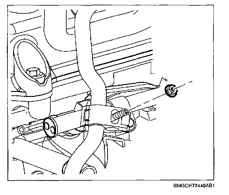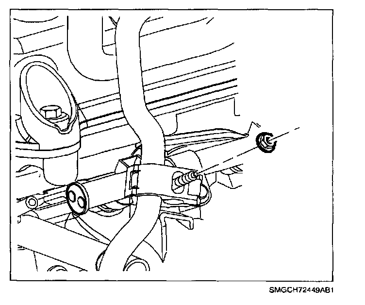 10. Remove the nut at fuel line clip and disconnect fuel line from rail.