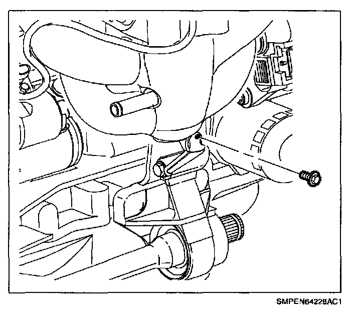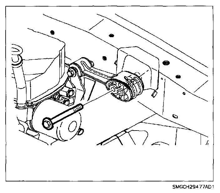 27. Remove transaxle strut-to-midrail bolt.