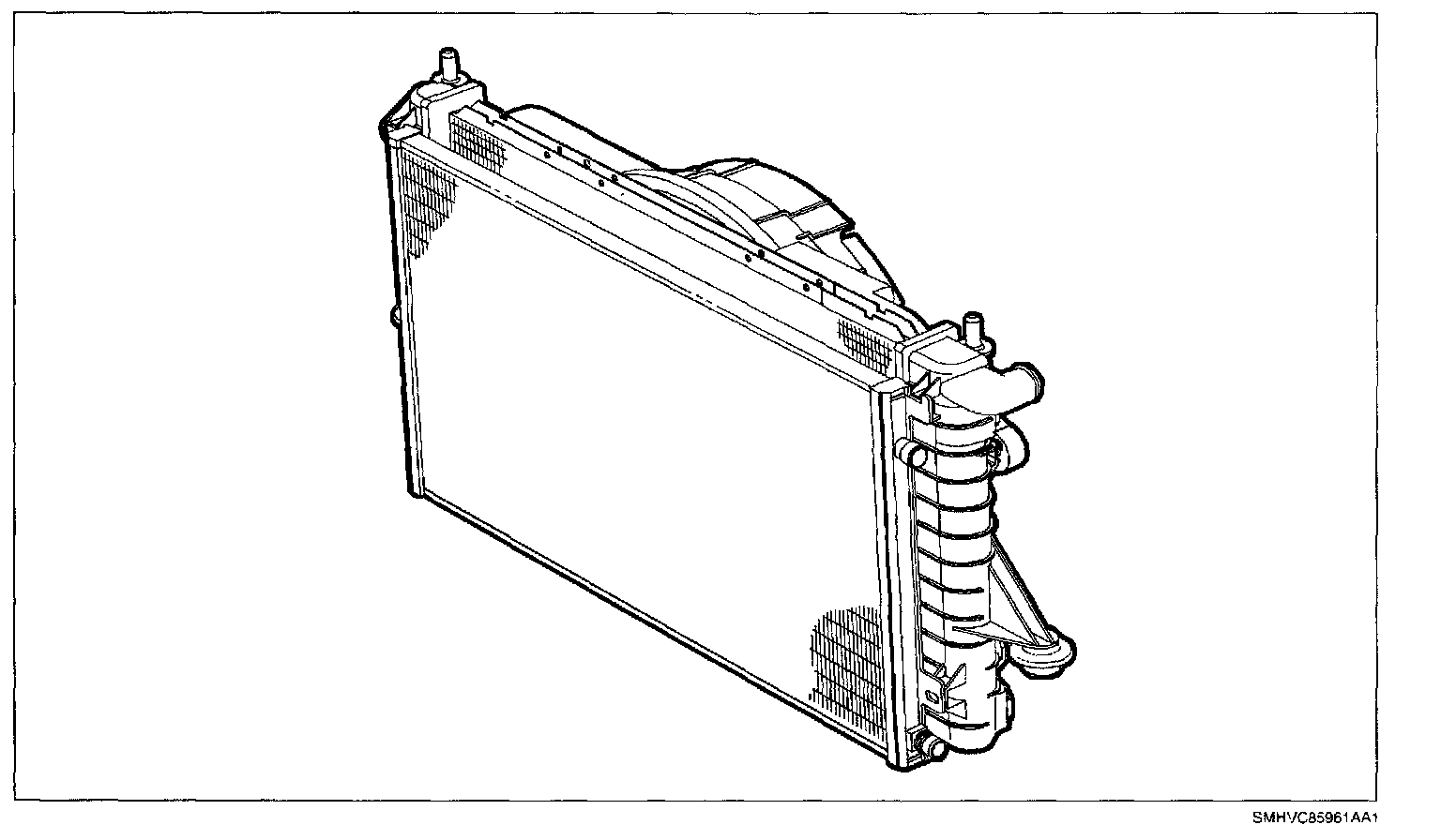 The condenser assembly in front of the radiator is made up of coils which carry refrigerant and cooling fins to provide rapid transfer of heat. The air passing through the condenser cools the high pressure refrigerant vapor causing it to condense into a liquid.