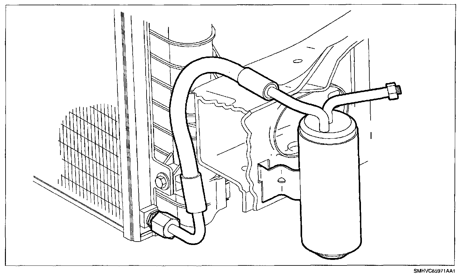 Connected to the condenser assembly outlet pipe, the sealed receiver - dehydrator assembly acts as a refrigerant storage container receiving R-134a liquid.