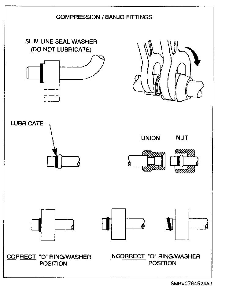 IMPORTANT: Do not lubricate the new slim line seal washer on the compressor side of the suction hose. The slim line seal washer cannot be interchanged with a typical O-ring in the A/C system. Use only suction line slim line seal washers as a replacement.
