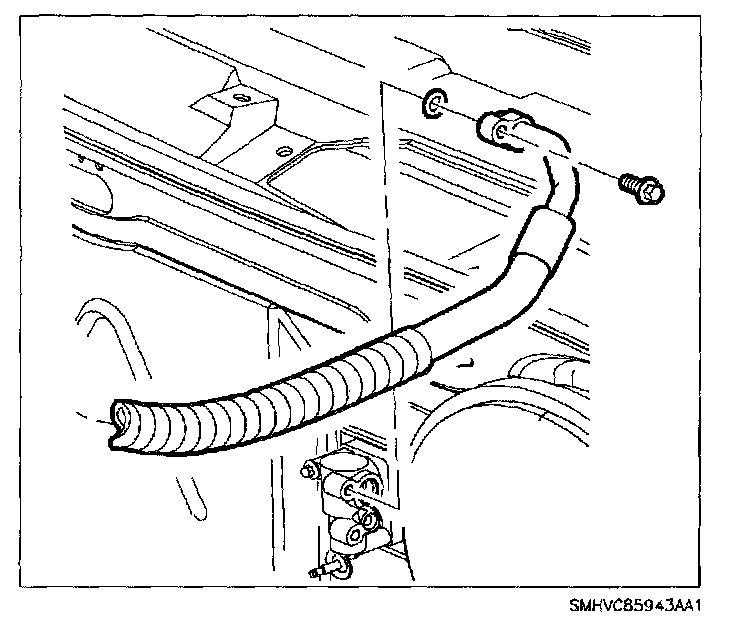 4. Route hose around outside of transaxle dip stick tube, under edge of battery tray, and under negative battery cable.