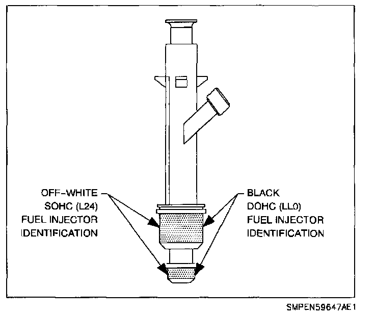 IMPORTANT: DOHC (LL0) arid SOHC (L24) fuel injectors are not interchangeable. Verify that the correct fuel injectors are installed in the fuel rail. The fuel injectors are identified by color coded plastic rings located near the bottom of the fuel injectors. The 2000 model year DOHC injector is identified by a pink ring, and the 2001-02 model year DOHC injector is identified by a black plastic ring.