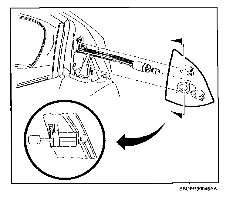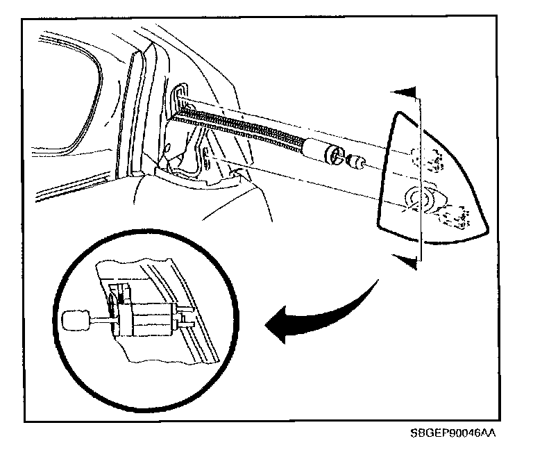 8. If manual remote mirror cable was removed from trim panel, install mirror cable into trim panel and tighten set screw.