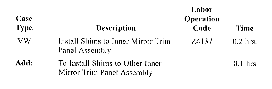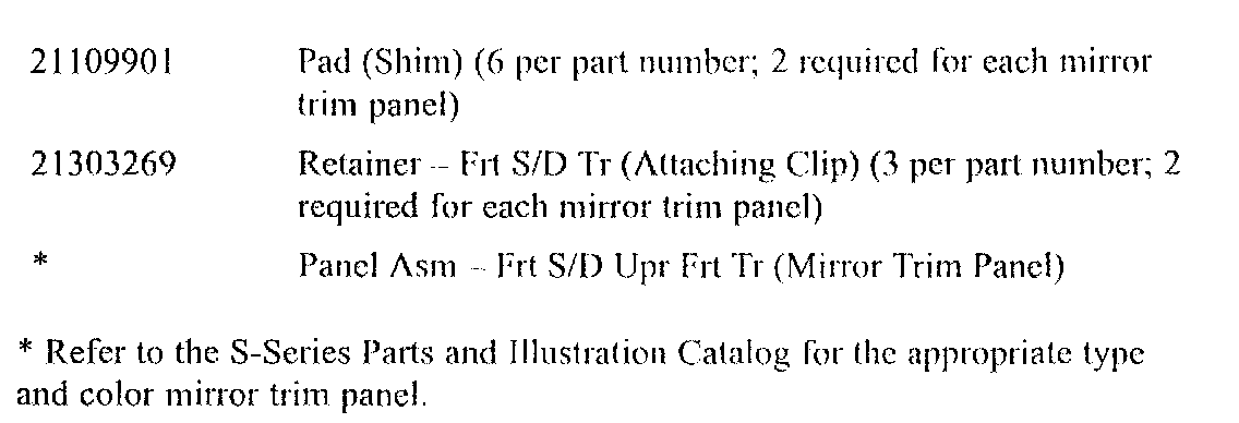 Follow the procedure in this bulletin to replace broken mirror trim panel, if necessary, and install a shim onto each tab on the mirror trim panel assembly.