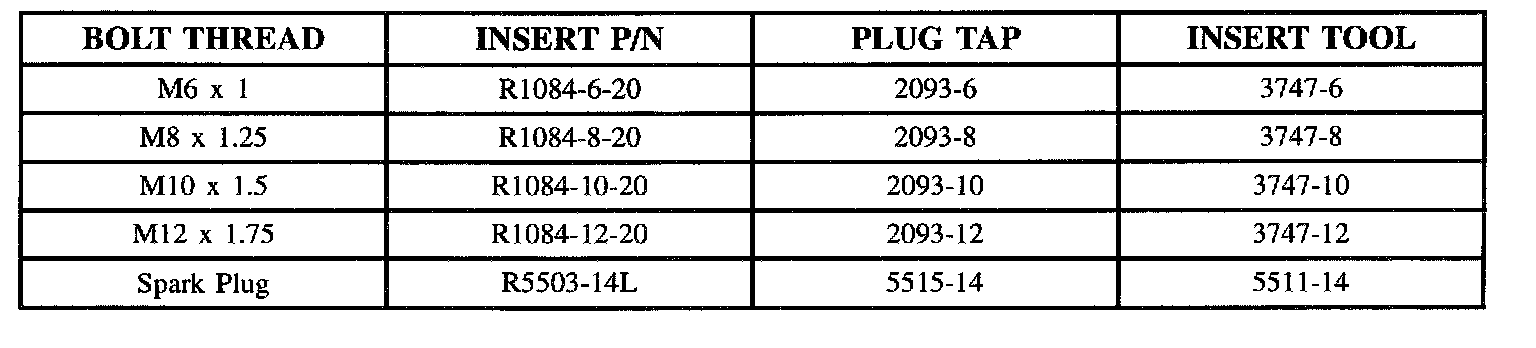 Heli-Coil Tool Numbers Chart