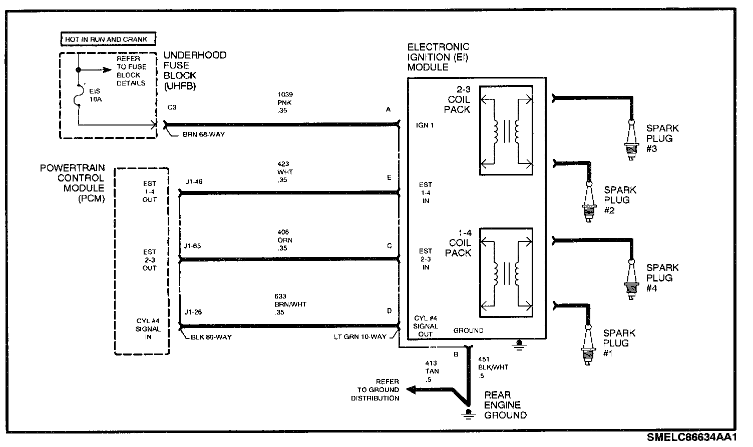 The PCM controls spark timing and dwell (spark On-time) under all engine running conditions. The Electronic Ignition (EI) module has the ability to charge and discharge the coil packs based on PCM control. The PCM uses a high control signal of near 5 volts to charge up the coil and a low control signal of near 0 volts to discharge the coil. If the coil is charged and the control signal is low, the coil will fire through its secondary towers. During engine crank, the PCM will pulse the Ignition Control (IC) circuit 1 and 4 high and low to test for faults in IC circuit 1 and 4.