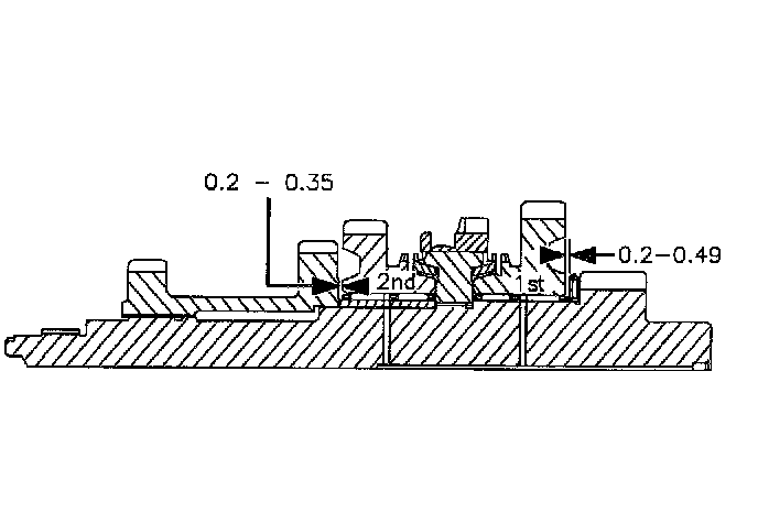 Clearance between 1st driven gear and 1st driven gear thrust washer Standard: 0.20 - 0.0495 mm (0.008 - 0.019 inch)