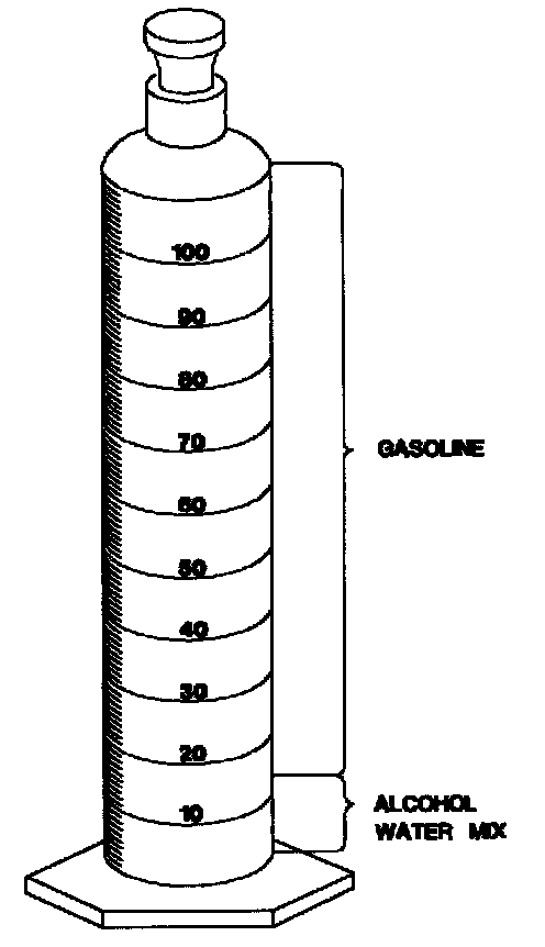 If alcohol is present in the fuel, the volume of the lower layer, which would now contain alcohol and water will be greater than 10 ml. For example, if the volume of the lower layer is increased to 15 ml it would indicate at least five percent alcohol in fuel. The actual amount of alcohol may be somewhat greater because this procedure does not extract all of the alcohol from the fuel.