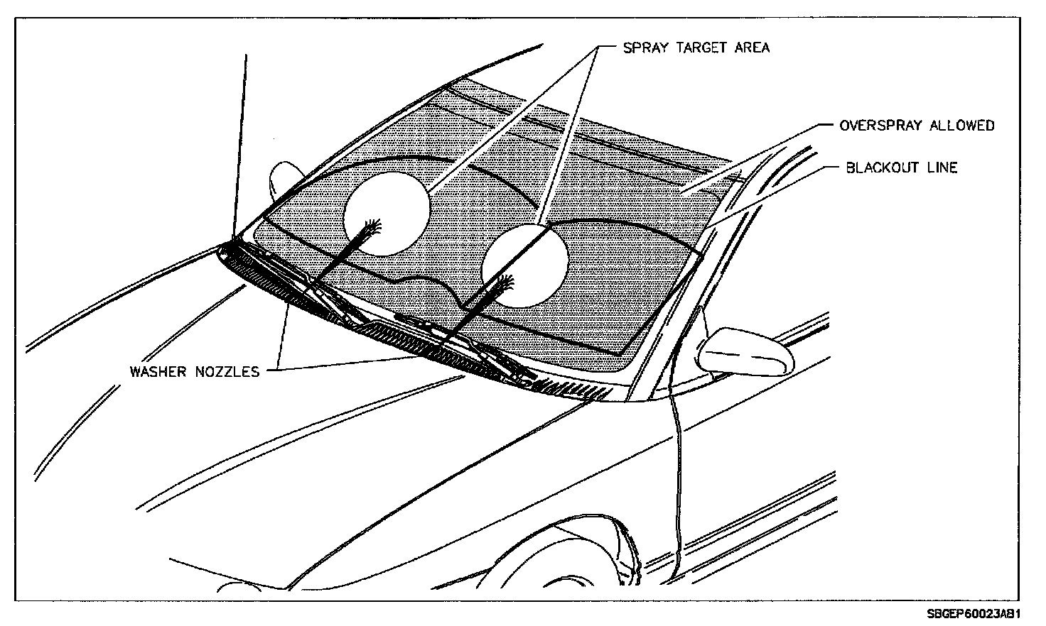 The washer nozzle spray pattern is identified in the illustration. If the nozzle is not delivering washer fluid according to the illustration, make sure that the nozzle is properly seated in the shroud top vent grille assembly.