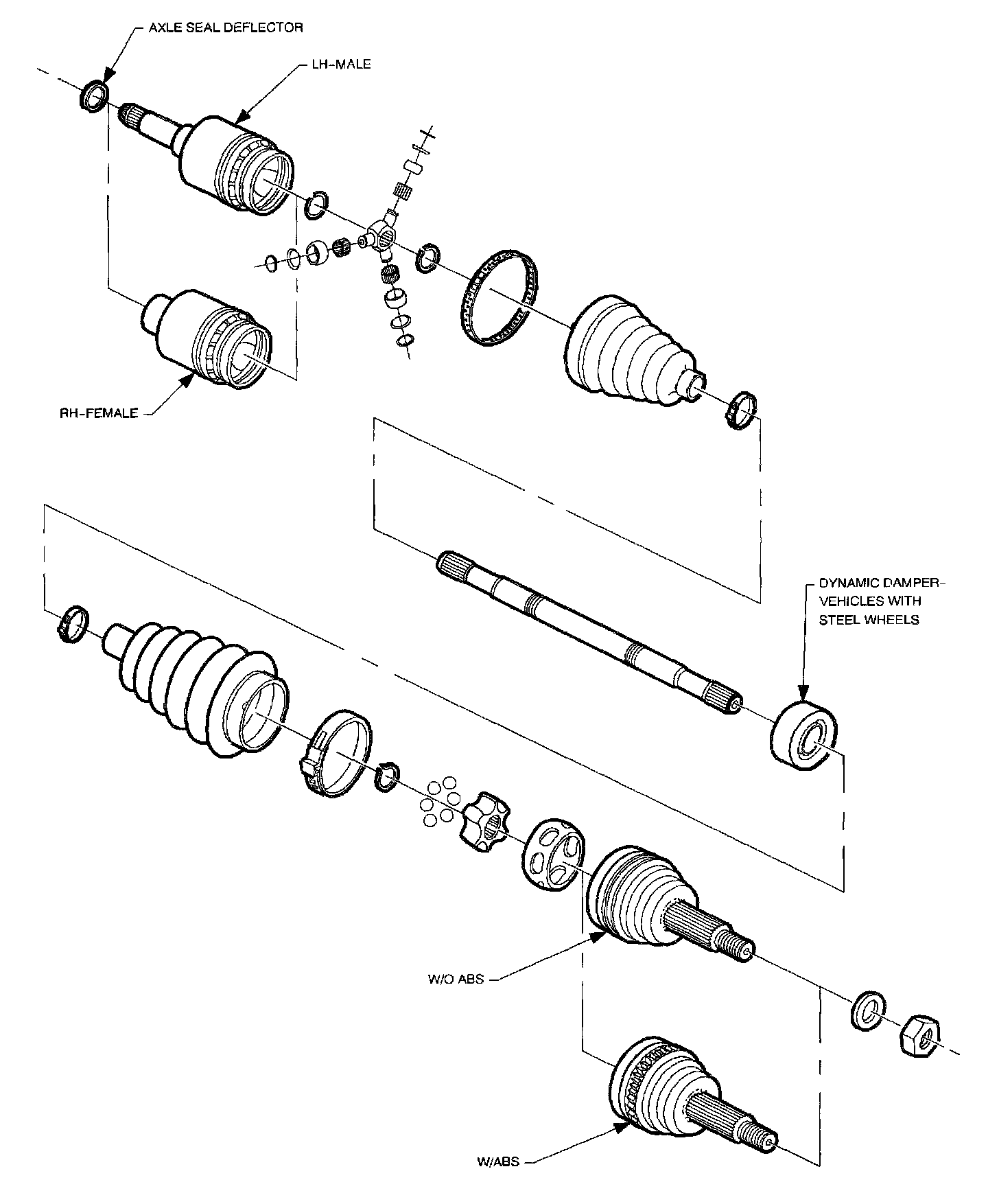 The drive axle assemblies used on Saturn vehicles consist of a tri-pot joint arid an outer Constant Velocity (CV) joint, connected by an axle shaft. Joints are used on the axle shafts to provide flexibility, since the axle assemblies must be able to move in response to suspension travel and steering inputs. The outer CV joint can swivel. while the tri-pot joint has the ability to swivel and move in and out. On the right side of the vehicle, an intermediate shaft is provided, allowing the left and right axle shafts to be of equal length.
