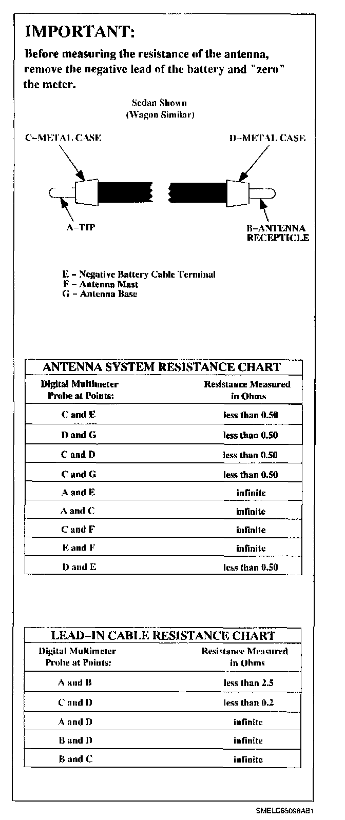 In case of continued reception or noise complaints, always check the lead-in antenna cable with a digital multimeter (refer to the illustration and chart). If long jumper leads are not available, check center conductor continuity by jumping the antenna coax cable to ground and checking for continuity from the center conductor at radio to ground. The type of coaxial cable used is RG-62/U.