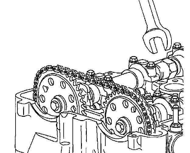 NOTICE: Use a 24 mm wrench to support the camshaft while applying torque to camshaft sprocket bolt. Do not torque camshaft bolts against timing chain, as it may damage the timing chain.