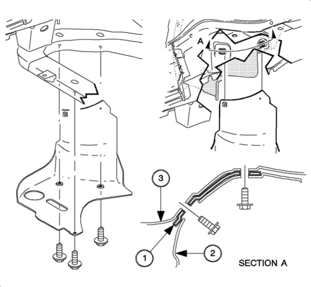 8. Install the lower cradle splash shield by sliding the shield (1) between the wheelhouse linen (2) and the wheelhouse (3). Install the splash shield to wheelhouse and cradle fasteners.