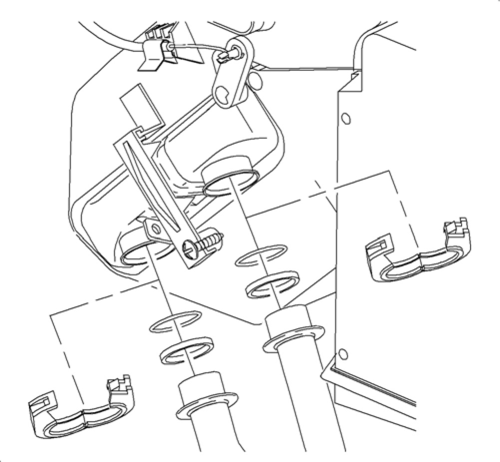 3. Install the heater pipes into the core and install the plastic clamps. The heater pipe clamps will only go on one way. The lower clamp hinge fits into the tab of the heater core retaining strap.